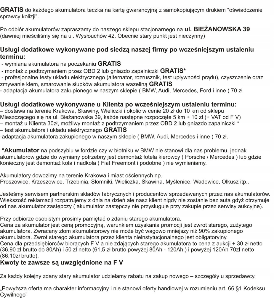 Na tej aukcji możliwy jest zakup wyłącznie dla klientów zdających zużyty akumulator. Nie ma możliwości zdania akumulatora w innym terminie niż w momencie dostawy.