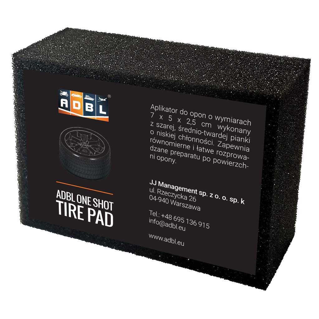 ADBL One Shot Tire Pad jest aplikatorem który można wykorzystać do aplikacji dressingu na opony oraz różnego rodzaju tworzywa sztuczne. Wykonany jest z ciemnoszarej pianki o niskiej chłonności.
