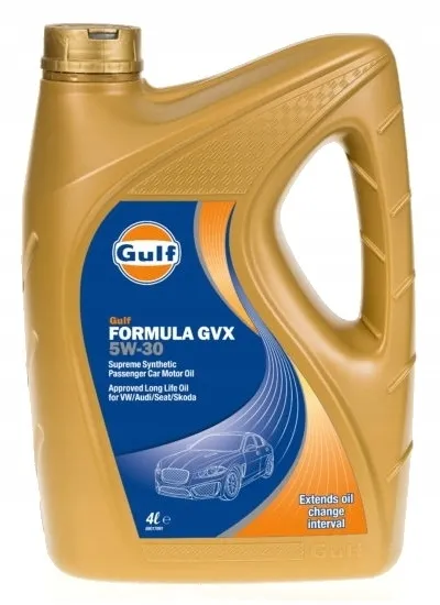 Gulf Formula GVX 5W-30 jest najnowszym niskoemisyjnym całkowicie syntetycznym olejem silnikowym zapewniającym mniejsze zużycie paliwa. Został on stworzony specjalnie aby spełnić wymagania wszystkich samochodów osobowych firmy Volkswagen. Olej powstał ze starannie dobranych syntetycznych baz olejowych oraz wysoko zaawansowanych technologicznie dodatków spełniających wymagania SAPS tak aby był w pełni kompatybilny z większością nowoczesnych Filtrów Cząstek Stałych silników diesla (DPF) oraz z Katalicznymi Dopalaczami Spalin w silnikach benzynowych. Pomaga przedłużyć żywotność silnika oraz utrzymać efektowność układów oczyszczania spalin w najnowszej generacji samochodach benzynowych i diesla. Olej został stworzony aby zapewnić wyśmienite osiągi w połączeniu z oszczędnością paliwa i przedłużonymi okresami między wymianami oleju.