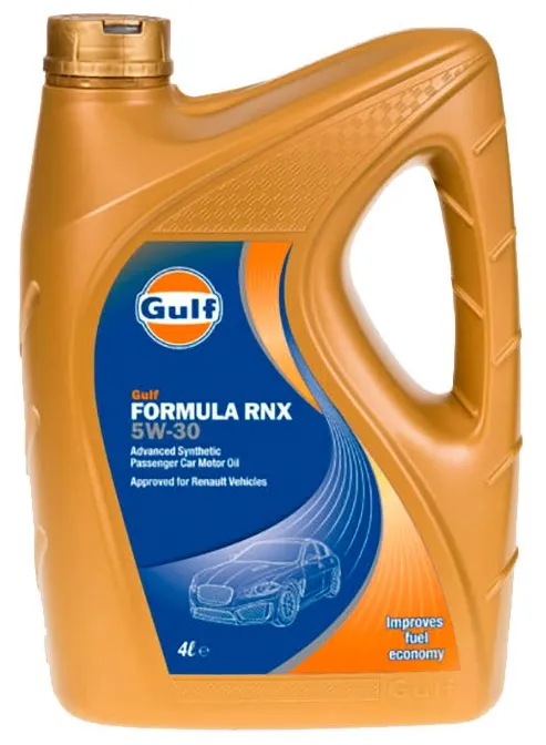 Gulf Formula RNX 5W-30 jest syntetycznym kompatybilnym z nowoczesnymi systemami katalitycznymi olejem do silników samochodowych zaprojektowanym z użyciem nowoczesnego niskopopiołowego (low SAPS) pakietu dodatków spełniającym normy Euro 4. Gulf Formula RNX 5W 30 jest specjalnie formułowany do smarowania w warunkach wysokiego ścinania i temperatury (HTHS>3.5mPa.s) silników benzynowych i diesla wyposażonych w filtry cząstek stałych (DPF) i trójdrożny katalizator (TWC) tak aby wydłużyć znacząco żywotność tych układów oczyszczania spalin. Gulf Formula RNX 5W 30 zapewnia doskonałą ochronę przeciwzużyciową i minimalizację odkładania się osadów w silniku i turbosprężarce. Olej został wyprodukowany w technologii która pozwala przewyższyć wymagania stawiane przez najnowsze modele aut Renault i innych producentów wymagających zalania silnika olejem spełniającym normę ACEA C4.