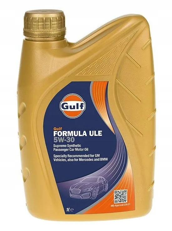 Oleje serii Gulf Formula ULE (5W-30 5W-40) to zaawansowane technologicznie syntetyczne niskoemisyjne oleje silnikowe do samochodów osobowych które wymagają olejów o średniej zawartości popiołów siarczanowych (MID SAPS). Zostały specjalnie zaprojektowane aby wydłużyć żywotność układów oczyszczania spalin używanych w modelach ostatnich generacji samochodów zarówno benzynowych jak i diesla.