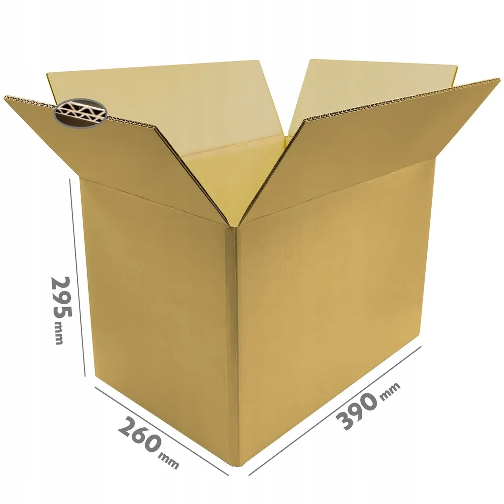 Wymiar kartonu klapowego z naszej aukcji to 390x260x295 mm (gabaryt „C” InPost) który zapewnia optymalną przestrzeń do przechowywania różnorodnych przedmiotów. Jest odpowiedni zarówno dla mniejszych jak i większych artykułów co czyni go wszechstronnym rozwiązaniem dla Twojego biznesu.