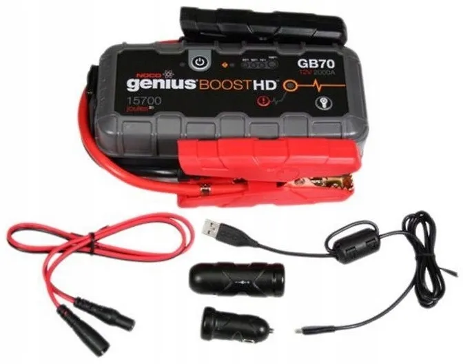 NOCO Genius® Boost™ GB70 2000A jest najmocniejszym przenośnym ultra -kompaktowym litowo-jonowym Jump Starterem przeznaczonym do awaryjnego rozruchu akumulatorów w samochodach osobowych samochodach ciężarowych samochodach dostawczych łodziach maszynach rolniczych kosiarkach i innych pojazdach łodzi motocykli pojazdów ATV kosiarek kamperów i innych. Jest niezwykle bezpieczna dla użytkownika. Posiada technologię zabezpieczającą przed iskrzeniem oraz odwrotną polaryzacją.
