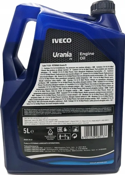 Produkt PETRONAS Urania FE 5W-30 to syntetyczny olej silnikowy opracowany we współpracy z firmami IVECO i FPT dla zapewnienia wysokiej wydajności i wyjątkowej ochrony silnika. Jego unikalna formulacja jest wynikiem tysięcy godzin testów laboratoryjnych stanowiskowych i drogowych.