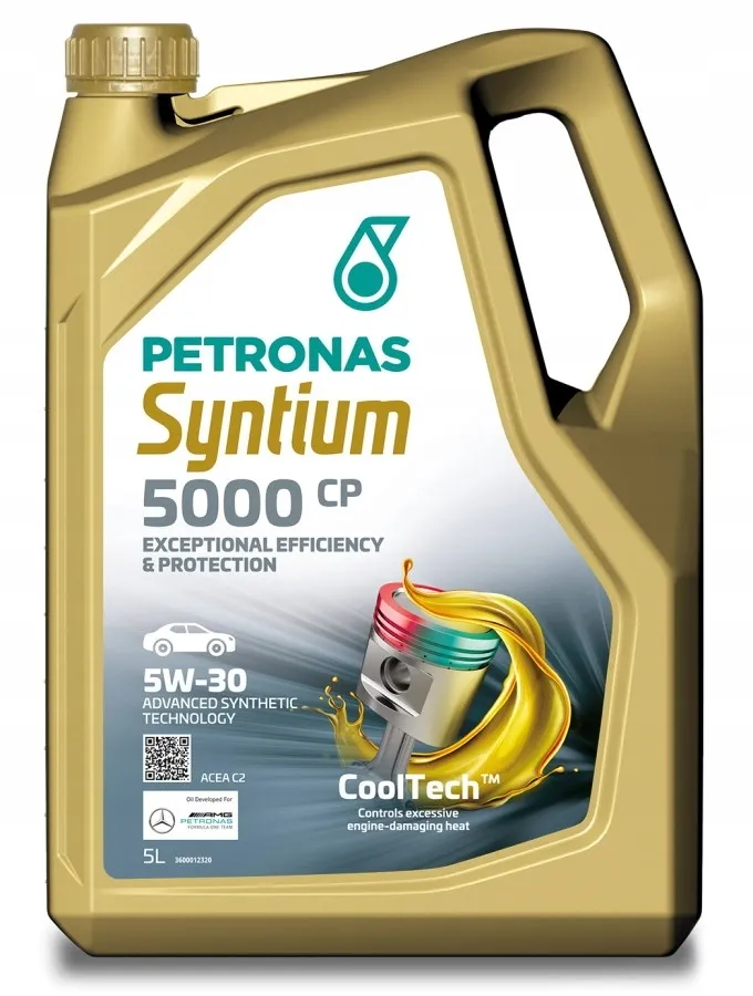 PETRONAS Syntium 5000 CP 5W-30 jest w pełni syntetycznym olejem silnikowym opracowanym w technologii °CoolTech™ która skutecznie kontroluje ciepło zapobiegając utlenianiu oraz degradacji oleju i tworzeniu się osadów aby chronić części i utrzymać wydajność silnika przez cały okres pomiędzy wymianami oleju.