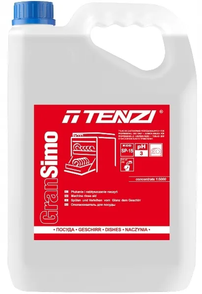 Płukanie i nabłyszczanie naczyń. Skoncentrowany lekko kwaśny preparat o zapachu zielonego jabłuszka do płukania i nabłyszczania naczyń w zmywarkach gastronomicznych i przemysłowych na bazie niejonowego związku powierzchniowo czynnego. Doskonale zwilża i nabłyszcza płukane powierzchnie w wyniku czego są one pozbawione smug oraz zacieków. Niewielka ilość aldehydu glutarowego sprawia że preparat posiada właściwości utrwalające a naczynia oprócz doskonałego połysku są idealnie czyste. Po wyschnięciu naczynia nie wymagają dodatkowego polerowania. Posiada atest PZH