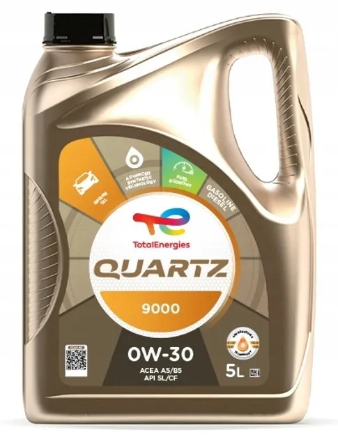 TOTAL QUARTZ 9000 0W-30 to olej w technologii syntetycznej opracowany by spełnić najbardziej restrykcyjne wymagania nowoczesnych silników benzynowych oraz diesla w samochodach osobowych. Olej TOTAL QUARTZ 9000 0W-30 jest odpowiedni dla większości obecnych silników.