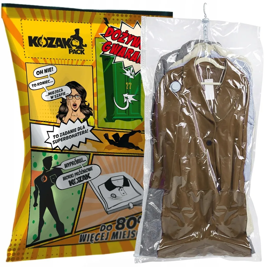 Worki próżniowe Kozak pozwolą Ci znaleźć dodatkowe miejsce w szafie. Dzięki możliwości włożenia kilku sztuk odzieży do jednego worka będziesz w stanie zmiejszyć ich objętość nawet o 80%.