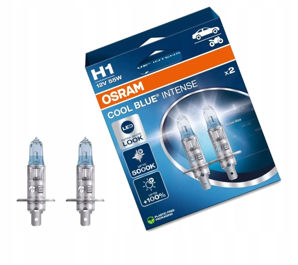 Odkryj COOL BLUE INTENSE – zaawansowane technologicznie żarówki halogenowe z mocnym światłem. Żarówka samochodowa CBI emituje światło o wysokim kontraście przypominające barwą światło dzienne co sprawia że mniej męczy wzrok niż standardowe źródła światła. W porównaniu do minimum homologacyjnego ECE gama produktów OSRAM COOL BLUE INTENSE dostarcza do 100% jaśniejsze światło. Nowoczesny design ze srebrną główką (H4/H7/H8/H11/HB4) jest idealnym rozwiązaniem dla reflektorów z przezroczystymi kloszami.