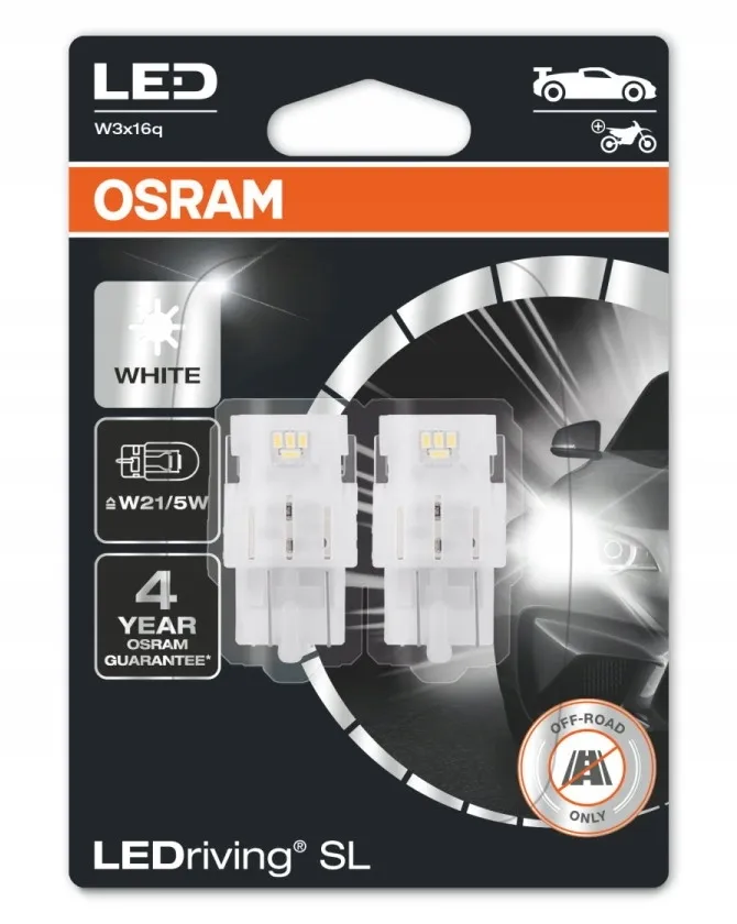 Zamienniki LED OSRAM LEDriving SL W21/5W oferują nowoczesne i intensywne białe światło o temperaturze barwowej do 6000 kelwinów. Te zamienniki LED pasują do wszystkich konwencjonalnych trzonków żarówek W21/5W. Łatwa wymiana dzięki rozwiązaniu plug&play.