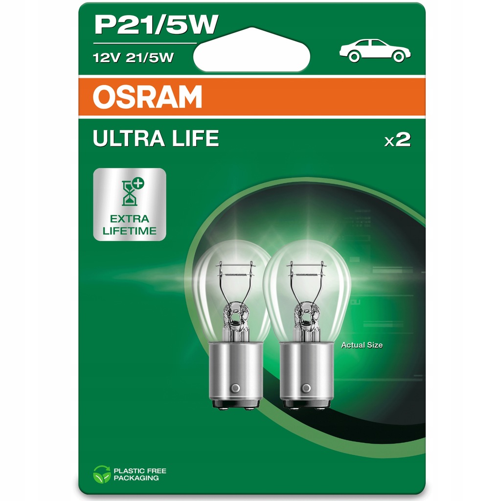 Dwuświatłowa żarówka P21/5W Ultra Life marki OSRAM przeznaczona do świateł stop i pozycyjnych samochodów osobowych i dostawczych. Produkty z ulepszonej linii Ultra Life działają do 3 razy dłużej niż standardowe żarówki. Wymienia się je znacznie rzadziej i są szczególnie polecane do jazdy nocnej - mniejsza liczba postojów w celu wymiany żarówek to oszczędność czasu i bezpieczniejsza jazda. Jest to idealne rozwiązanie dla samochodów które posiadają światła o utrudnionej dostępności. Produkty z serii Ultra Life są również przyjazne dla środowiska - rzadsze wymiany to mniejsza ilość wytwarzanych odpadów.