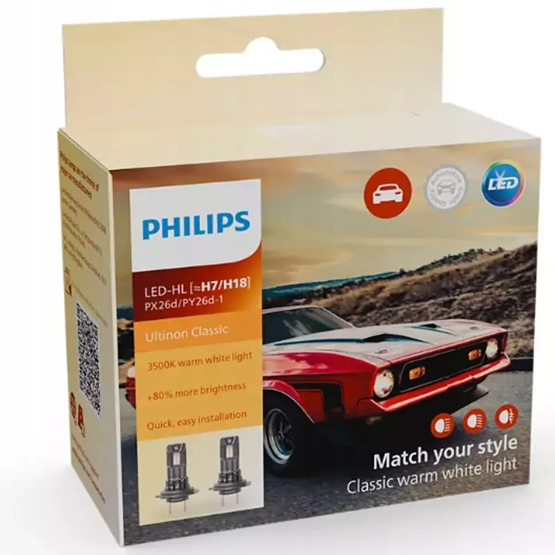 Mocniejsze światła bez kompromisów w wyglądzie! Żarówki Philips Ultinon Classic LED emitują eleganckie i ciepłe białe światło podobne do halogenowego nadając twojemu samochodowi ponadczasowy wygląd. Dostosuj je kolorystycznie z pozostałymi przednimi światłami i korzystaj z zalet poprawionej jasności dzięki diodom LED. Doświadcz idealnego połączenia klasycznego stylu z nowoczesną technologią.